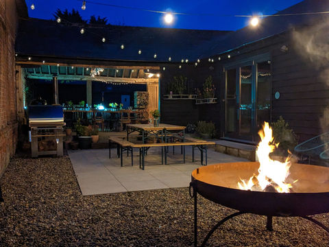 We have arange of spaces for groups to come together. The Piggery is an indoor relaxing space for a sauna, chill around a fire pit outside, or more active with gym equipment, yoga. The Cartloge is an undercover loggia dining space with outdoor kitchen - seats 20 people. Tithe Barn, is a large old suffolk barn which can hold - comfortably seats 50. .The Horseshoe is a semi-circular mound idea for informal dining performance area. There are plenty of other areas that can be use outside for group gatherings or dining experiences.